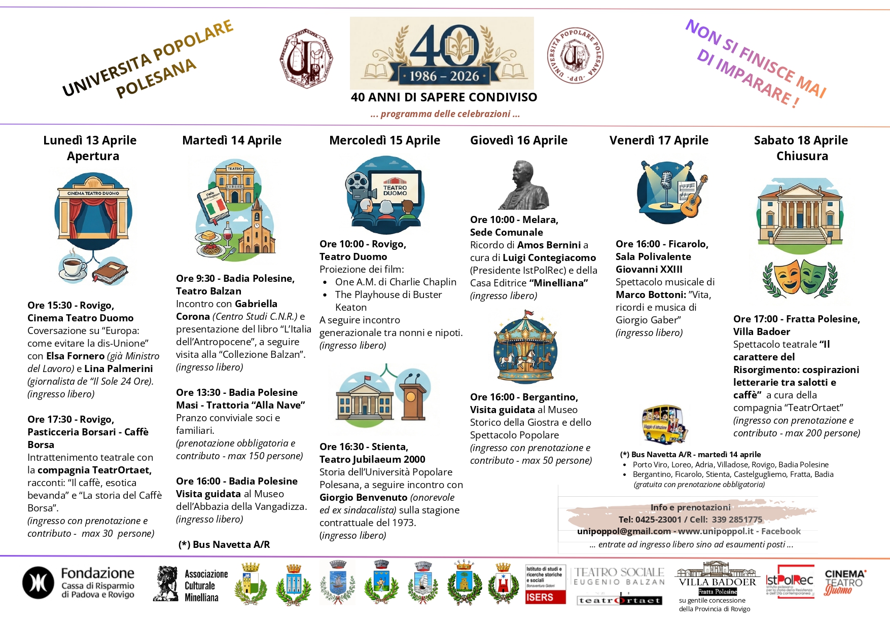 La settimana dal 13 aprile al 18 aprile si celebra il 40° anniversario dell'Università popolare polesana (1986-2026) con tanti eventi sul territorio.